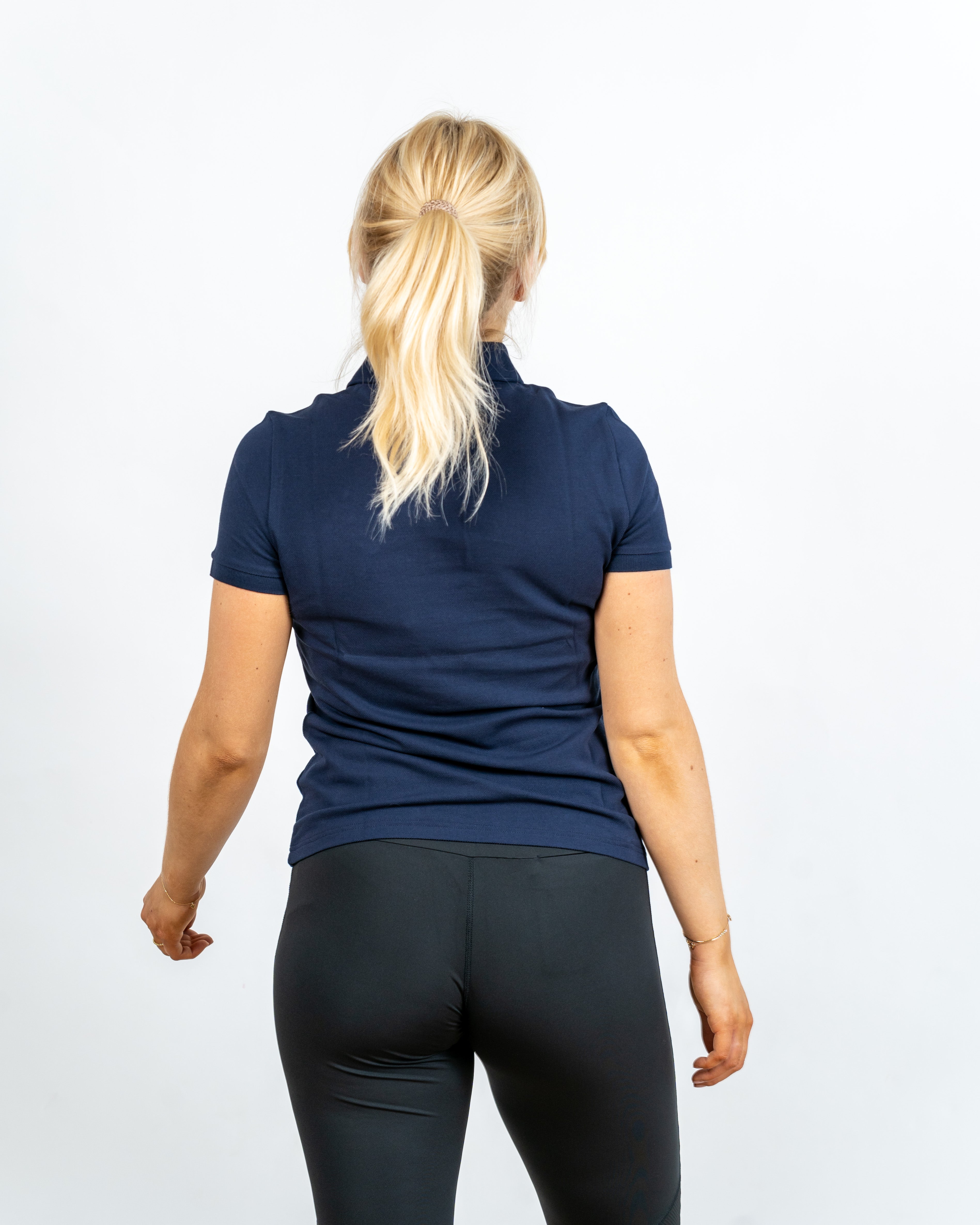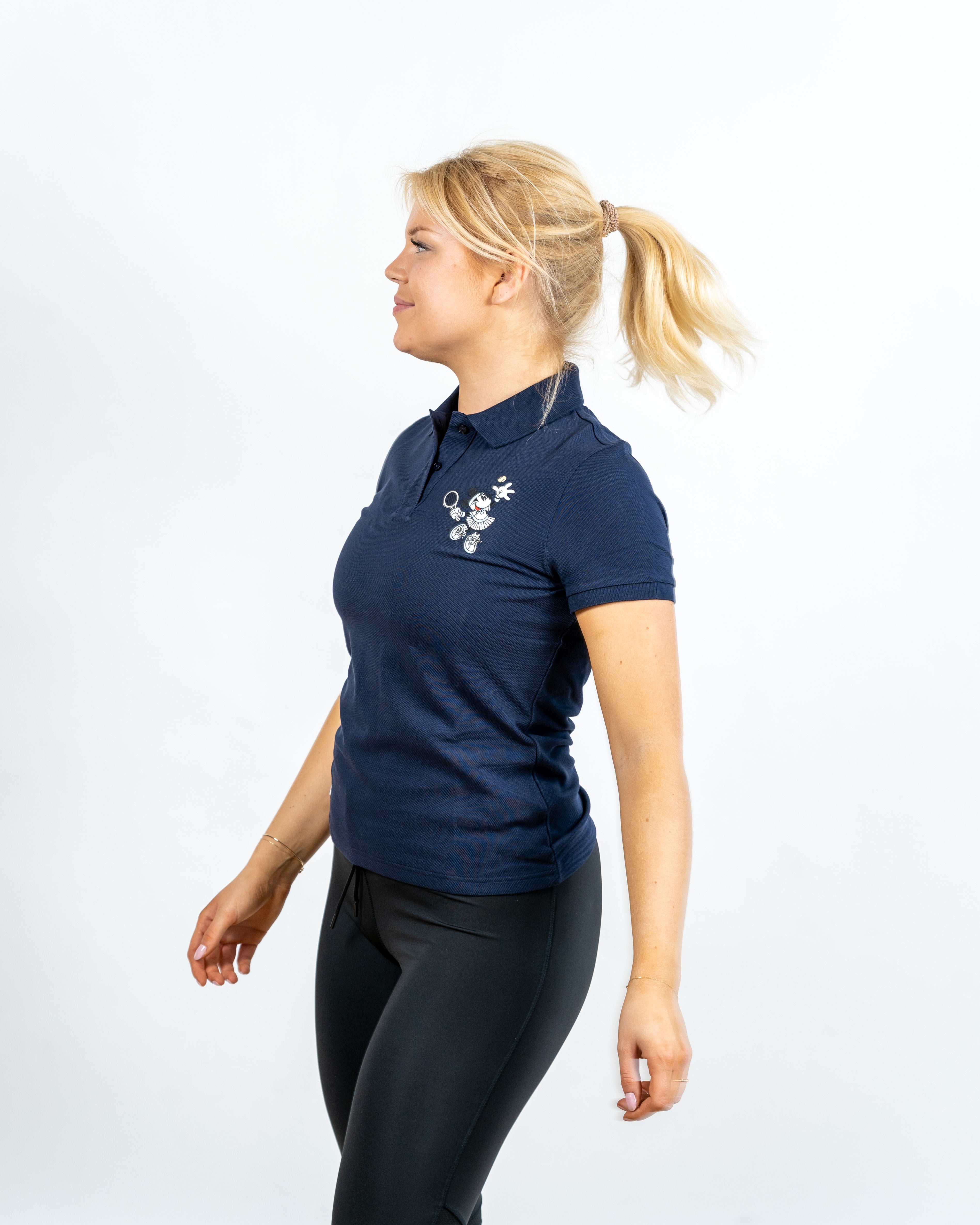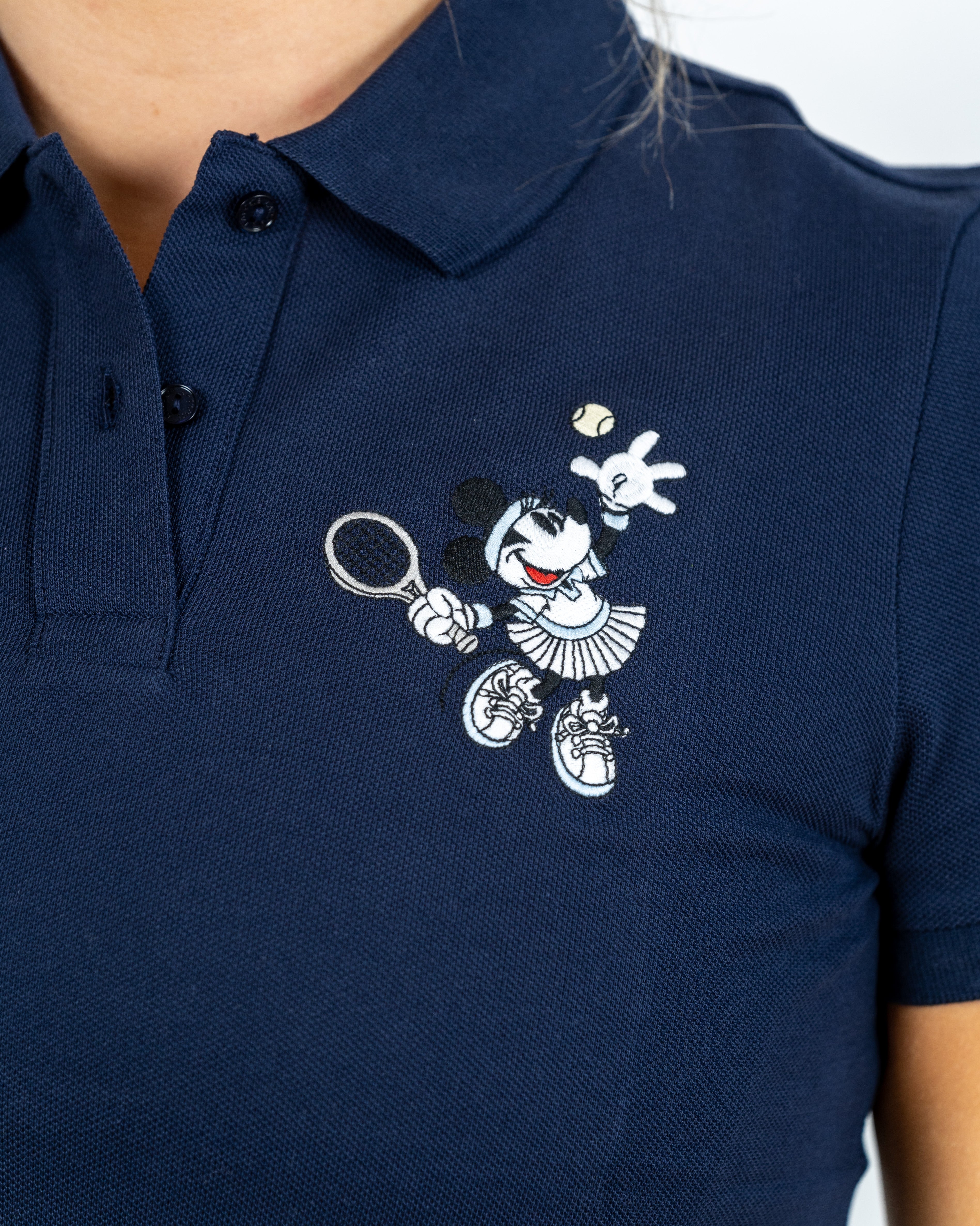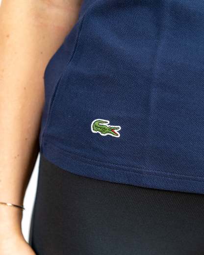 Polo clasic în albastru marin din colecția ediție limitată Lacoste în colaborare cu aniversarea de 90 de ani a lui Mickey și Minnie Mouse.