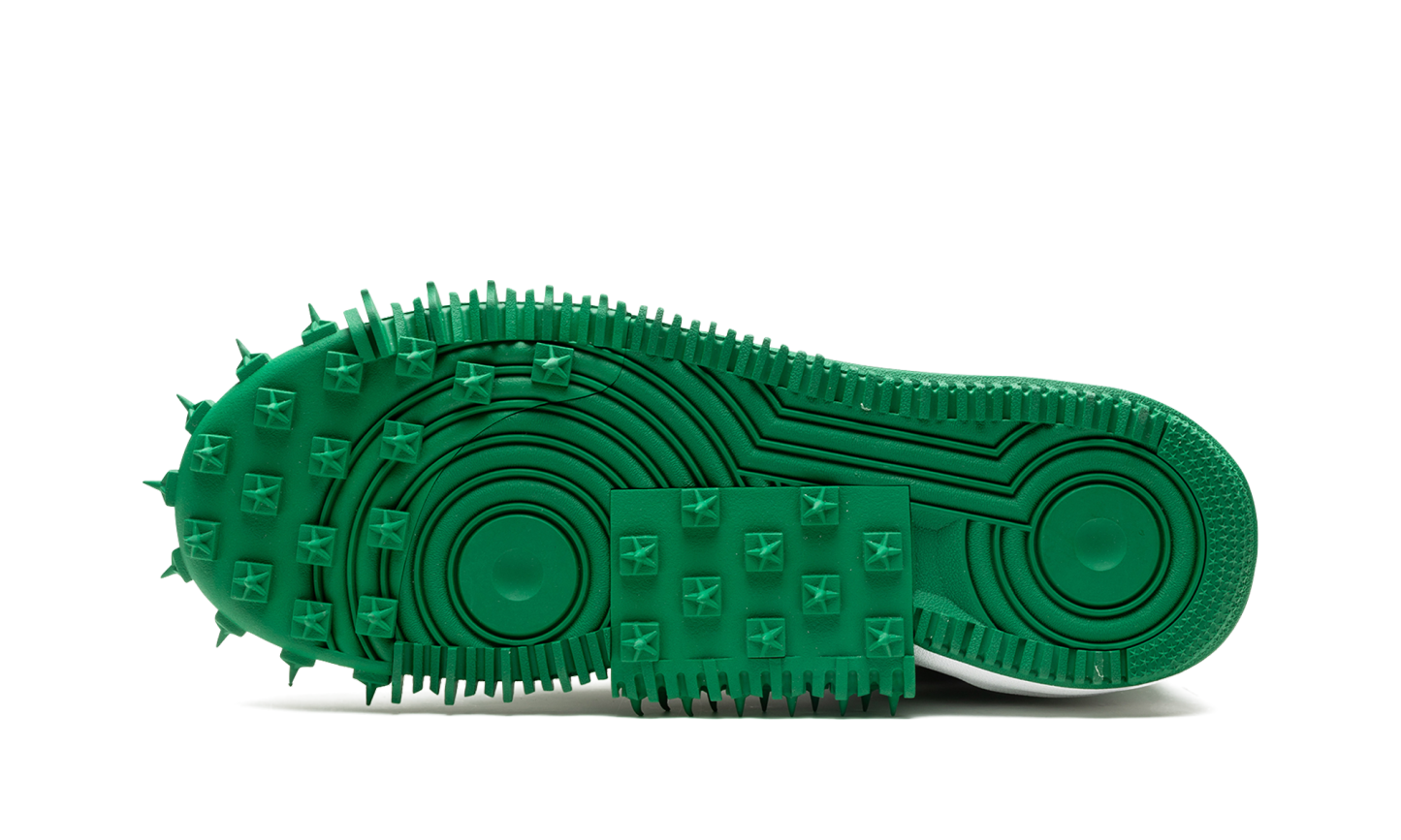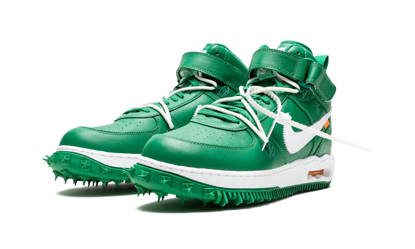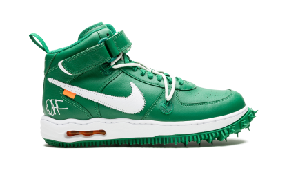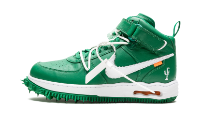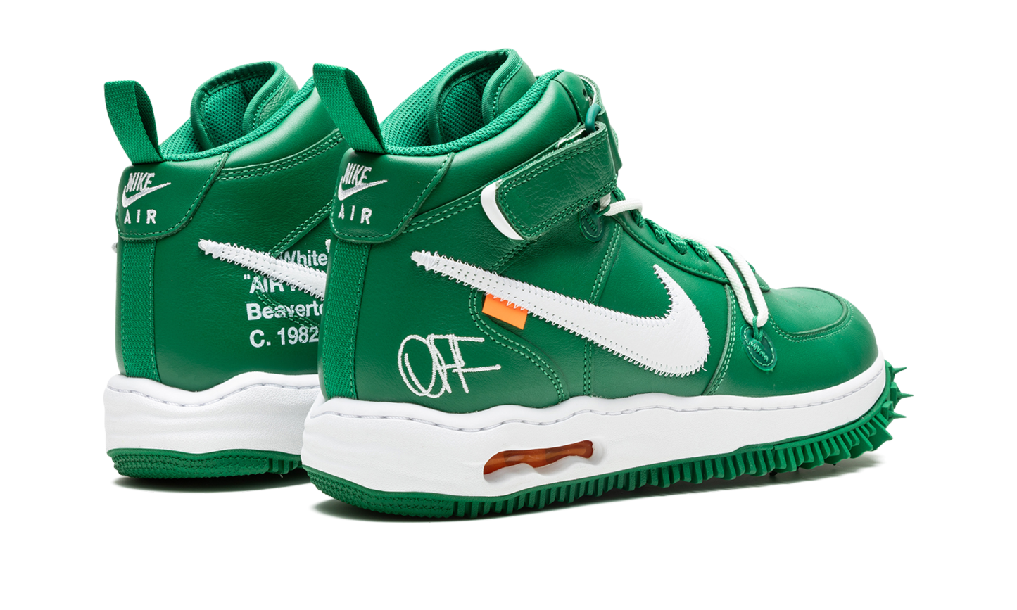 Nike Air Force 1 Mid Off-White Pine Green este realizată din piele verde premium pe partea superioară a adidașilor. Albul a fost folosit pe branding, fermoar, Swoosh și talpă intermediară. Acești adidași se inspiră din pantofii atletici cu un design cu vârfuri pe tălpi.