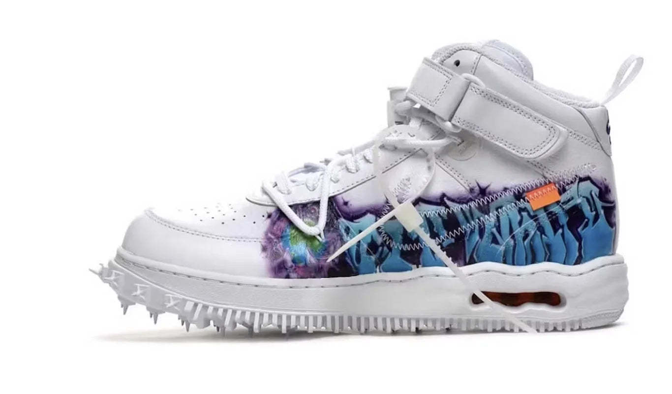 Nike Air Force 1 Mid Off-White Graffiti White aduce un design unic inspirat din lumea vibrantă a artei stradale.