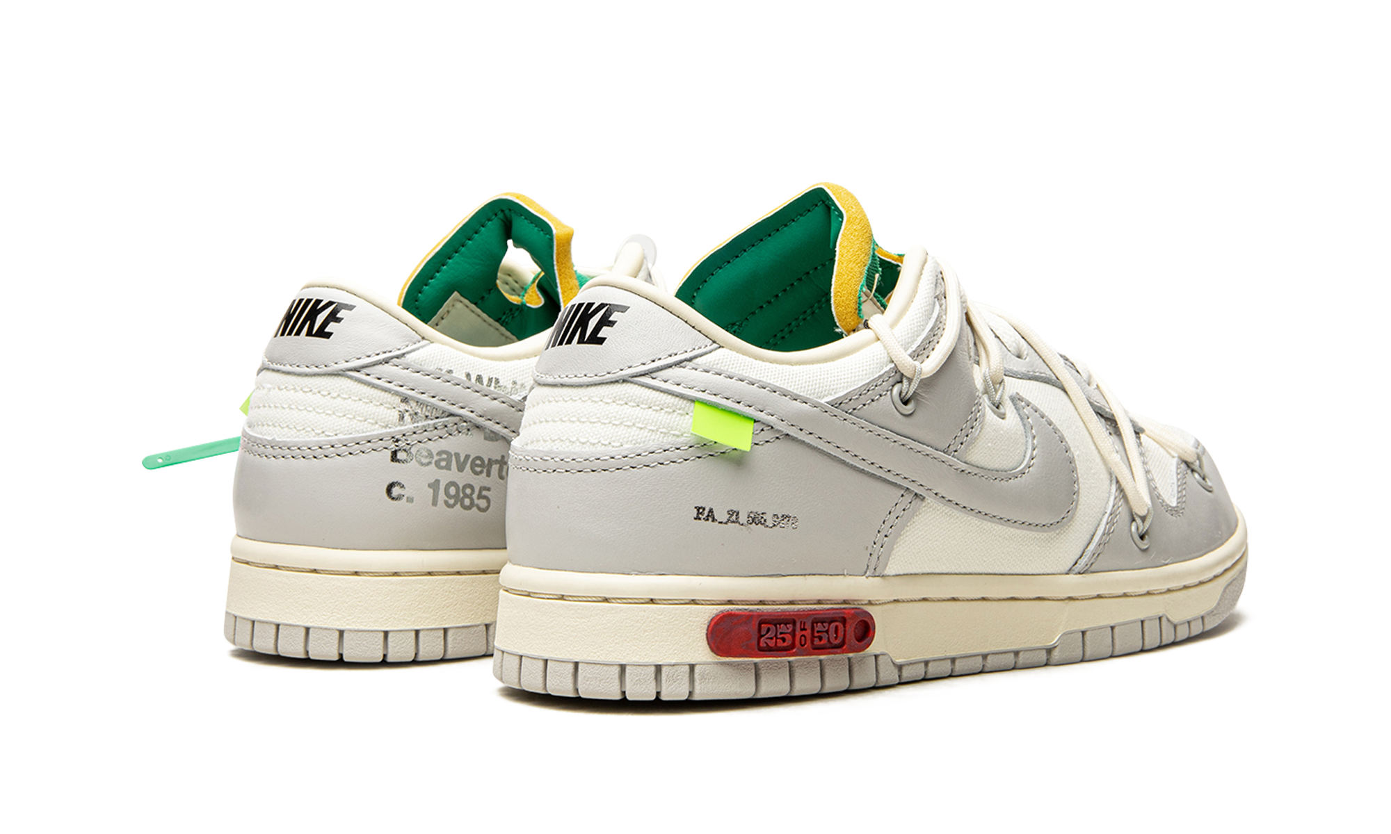 Acest model este realizat din piele albă cu acoperiri gri și iconica tipografie Helvetica sub Swoosh-ul lateral. Designul este completat de limba din spumă în nuanțe de verde și galben, a doua șireturi și patch-ul dreptunghiular atașat de Swoosh. Pe intermediul lateral se află inscripția "25 din 50", care confirmă că este o ediție limitată de doar 50 de perechi. Aspectul general este completat de intermediul din cauciuc alb, vârful perforat și brandingul Nike pe călcâi.